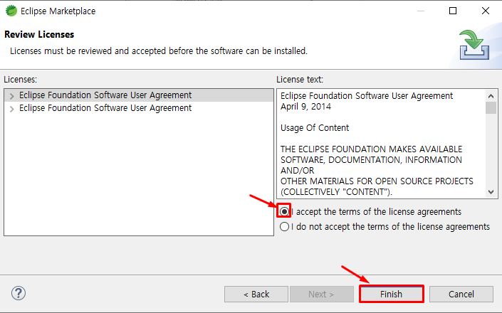 특별히 다른 설정 할 필요 없이 Confirm, 라이센스 동의 후 Finish 버튼 누르기