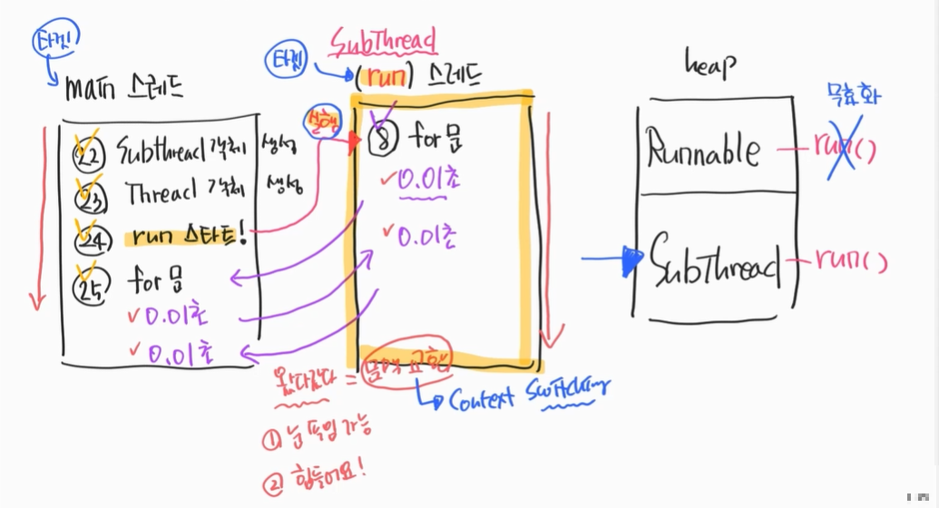 22번 라인 - SubThread 객체 생성 : 메모리에 SubThread 클래스 올리기