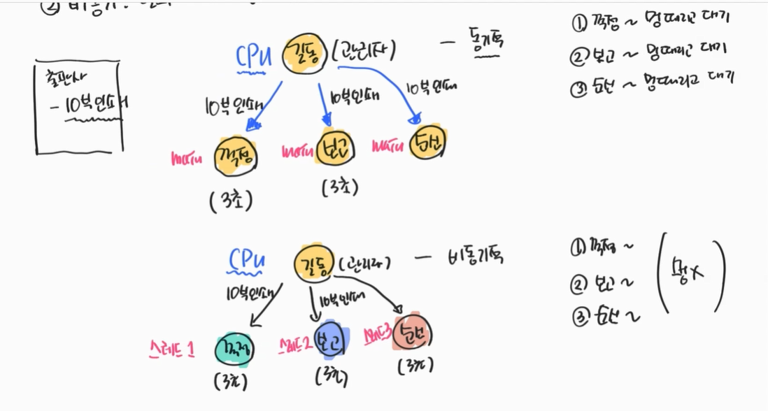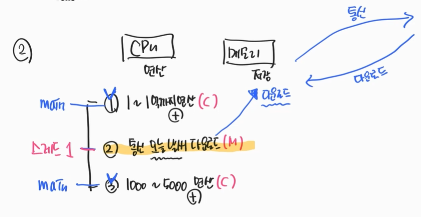 비동기적으로 처리하면 메인스레드 하나에 서브스레드 3개
