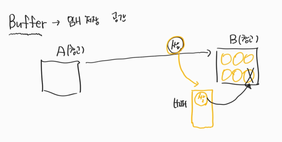 - A가 버퍼에 내용을 담아 B에게 보낼 준비를 한다. B 버퍼가 비어있어 전송 가능.