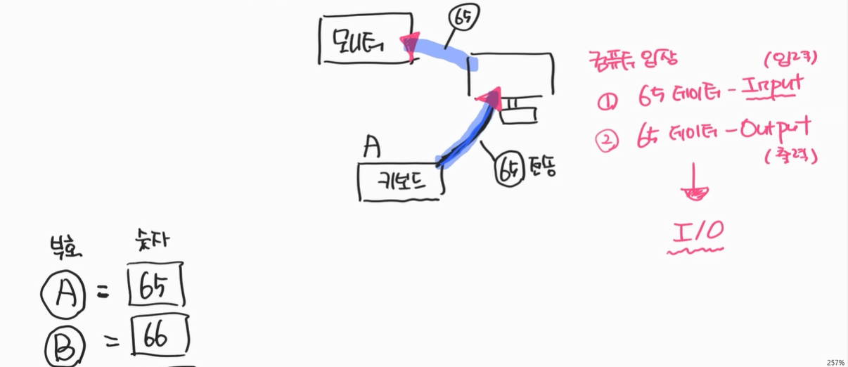 // 1. 키보드 A를 인코딩해서 01000001 으로 컴퓨터에게 전송