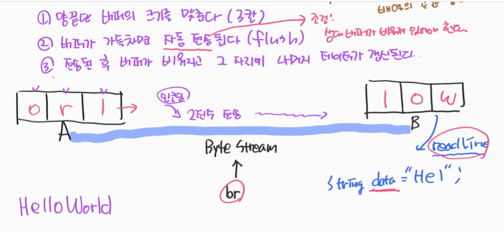 버퍼가 가득차면 상대 버퍼가 비워져 있는 경우에 자동 전송된다.(flush)