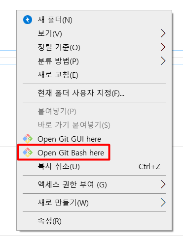 설치 완료 후 탐색기 빈 화면에서 우클릭 - Git Bash Here 하면